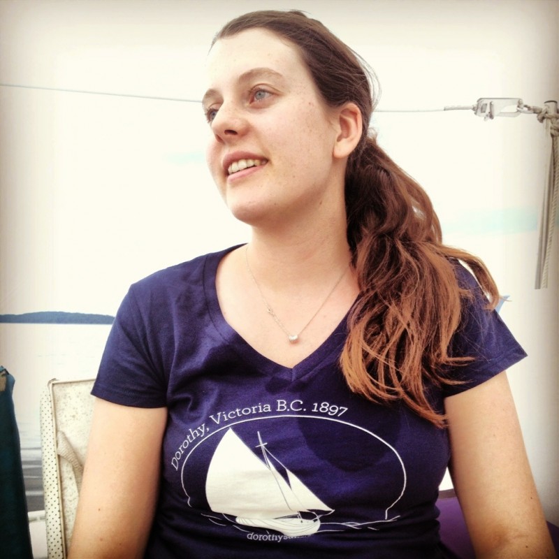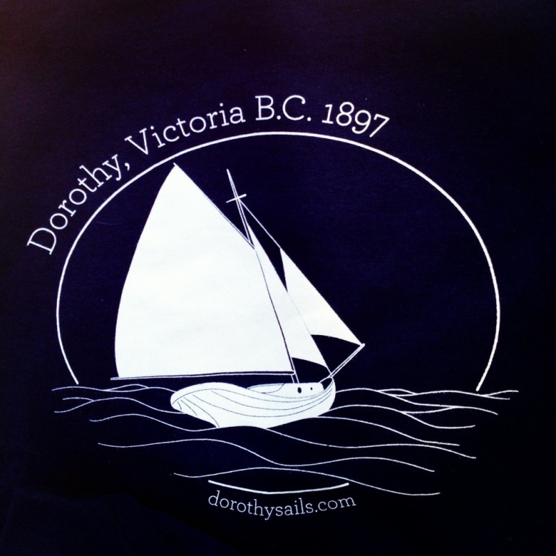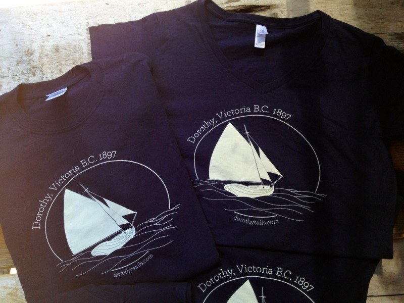 I’m super excited and deeply grateful that so many people helped out with this first step in our campaign for production funding. Tony Grove, the restoration specialist working on Dorothy, is also a marine artist. He created an original illustration of Dorothy at sail that captures her gorgeous fantail (more of his distinctive artwork here: http://www.tonygrove.com/artwork/photo-gallery.php) Many thanks to Bryan McCrae of Filament Communications who rendered the image and added text, and Senini Graphics in Nanaimo who gave us a great rate and professionally silkscreened the tees.