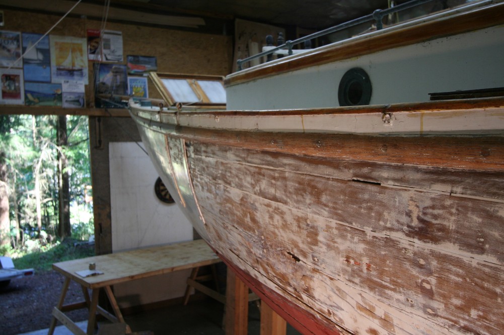 So I am thrilled every day that I get to work on the story of Dorothy, because every day is a true adventure with her. As Tony (the boatbuilder restoring Dorothy for the Maritime Museum of BC) was sanding down her port side hull last week, after tediously stripping the paint, we could see a potential story in every plank, and new questions arose about construction practices of the day: Her original planks are flat-sawn, not quarter-sawn like you would typically see today. Is that because of available wood at the time, or is there a technical reason for it? Those original planks were scarfed together – was that common practice rather than butting them end-to-end? There is a mix of materials used for paying the seams – lead putty, Portland cement, and even epoxy used for patches large and small – what’s the story here?