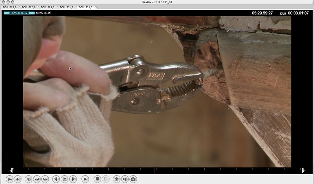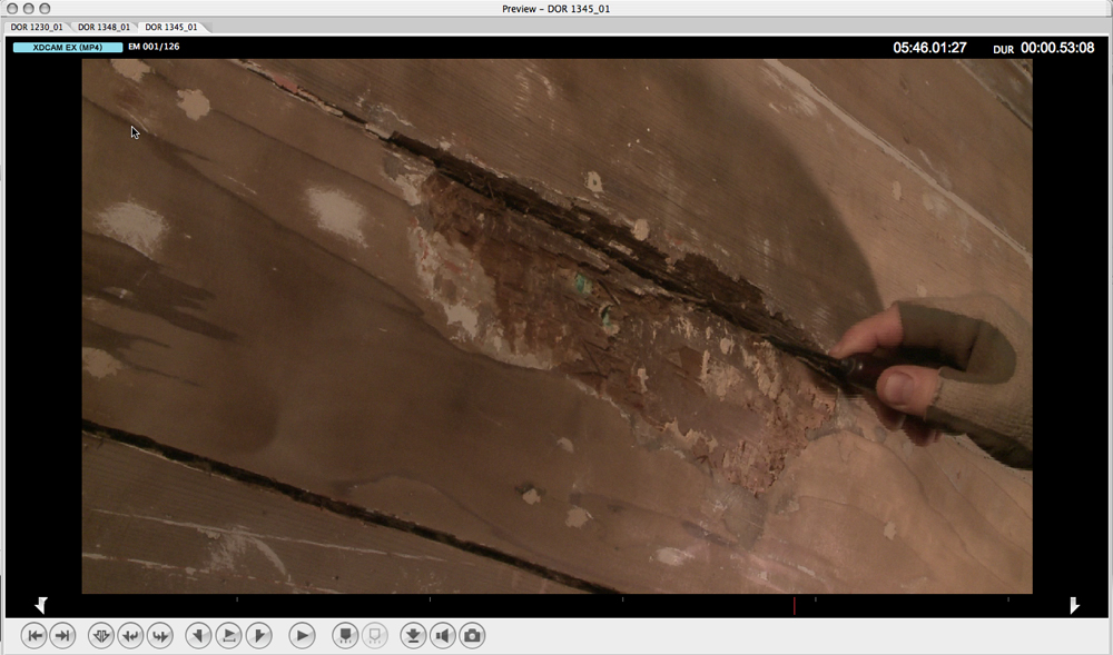 Yesterday, Tony got to remove a big patch on Dorothy‘s starboard side to see what lay below. It was above the waterline and such an obvious repair that it stuck out like a sore thumb in every shoot we did. It was interesting to see what happened to the cotton and oakum caulking under that patch, relative to the still-intact caulking in the rest of her planks. Imagine – a twisted line of oakum and cotton with linseed oil pounded into these seams… lasting 116 years! It’s remarkable.