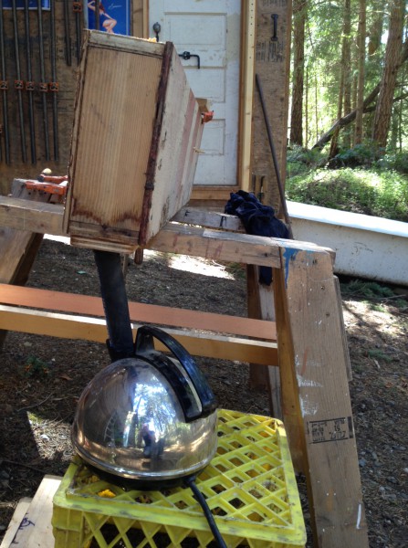 And the heating agency is … shall we say … less than imposing. The box Tony set up outside his shop for this job uses a simple electric kettle recycled from the local depot, and a piece of rubber radiator hose.